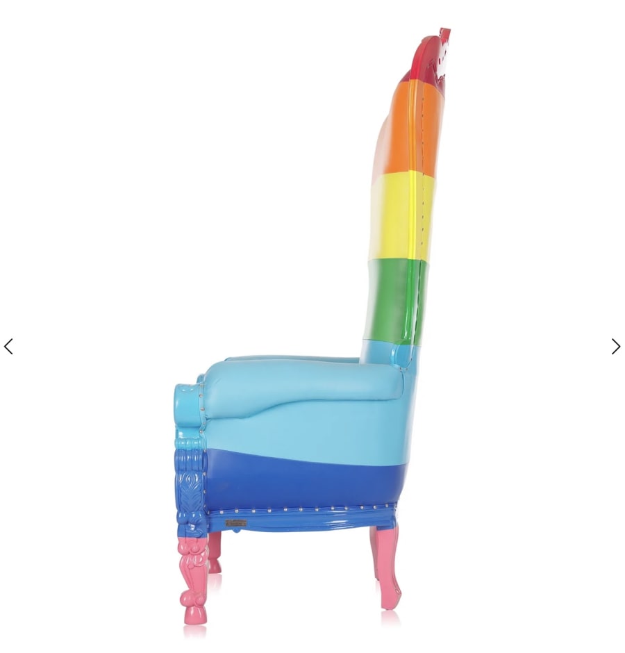 Bring some royalty into your life with this stunning "Tiffany pride edition" queen throne chair. Sit in absolute comfort with this beautiful chair! This chair would be stunning in all venues such as weddings, birthday parties, and much more! This chair is a part of our unique pride collection, it is absolutely unique and very spunky to the eyes!