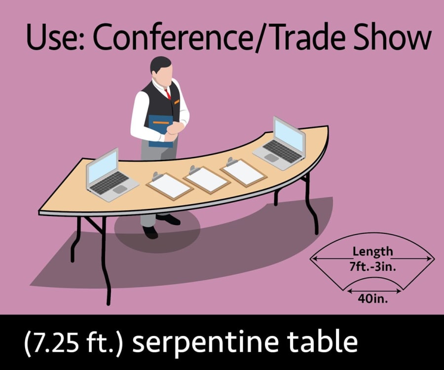 This semi-circular wood folding table allows you to create a serpentine, half circle or full circle table. The serpentine table allows you to create beautiful arrangements for weddings, banquets and other events. Create a serpentine table by placing two tables in alternate directions. Create a half circle or full circle by placing two or four tables together from end-to-end.