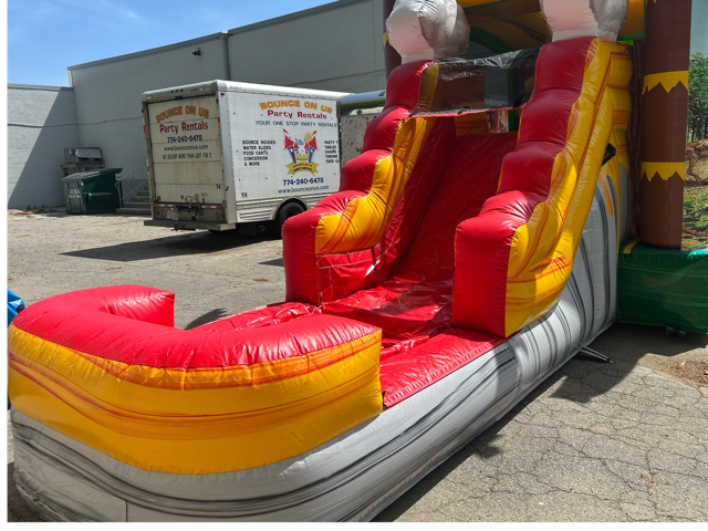 Looking for bounce house rental, water slide rentals Tropical Dinosaur Wet/ Dry Combo in Boston, Needham, Braintree, Fall River, Brockton, Whiteman, Woburn, Westwood, Sharon, Easton & Bridgewater? We’ve got you covered! Our professional team ensures timely delivery, safe setup, and thorough sanitation for peace of mind and a stress-free experience.