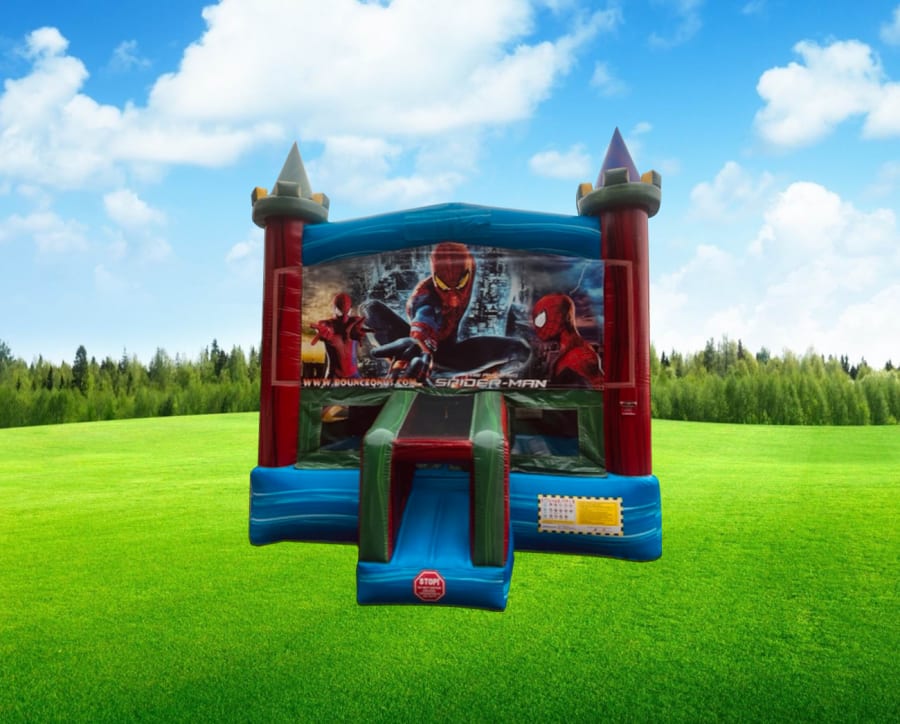 Our new Spiderman Basic Bounce Castle will keep the party going all day. This large bounce house can hold up to 10 kids easy and still have room to slam dunk the ball. This unit is enclosed and has a roof to keep the sun out. We carry over 50 different themes for this bounce house. Choose from over 50 different themes at no extra cost...