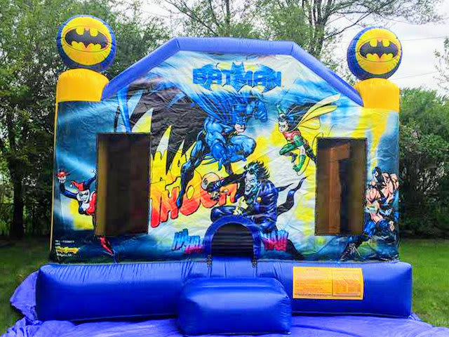 Our Batman Bounce Castle Combo will keep the party going all day. This medium bounce house can hold up to 10 kids easy. This unit has punching bags & basketball hoop with ball.