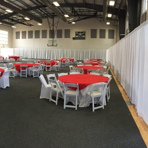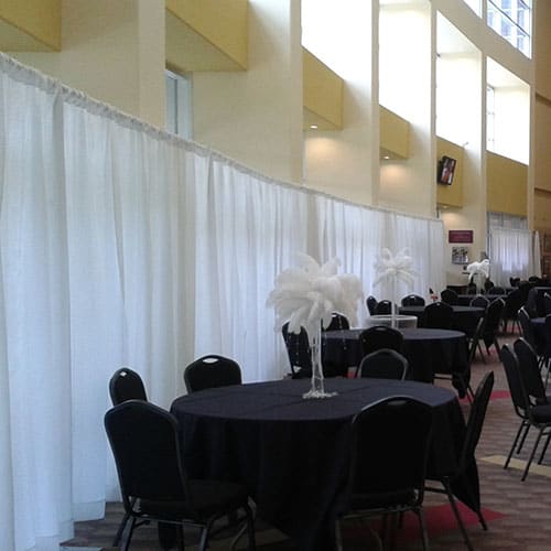 BOU Pipe and Drape for a beautiful way to add elegance to your wedding or event. Our unique new pipe & drape backdrop system can be easily setup in a matter of minutes - no experience required! Each backdrop is adjustable for a width of up to 12 feet wide, and height of 8 or 10 feet tall. The backdrop rental kit features the highest quality poly premier drapes. All backdrop drapes are white, and you can add a glow of color with a lighting add-on package. The backdrop drapes are wrinkle-free, so no ironing is required!