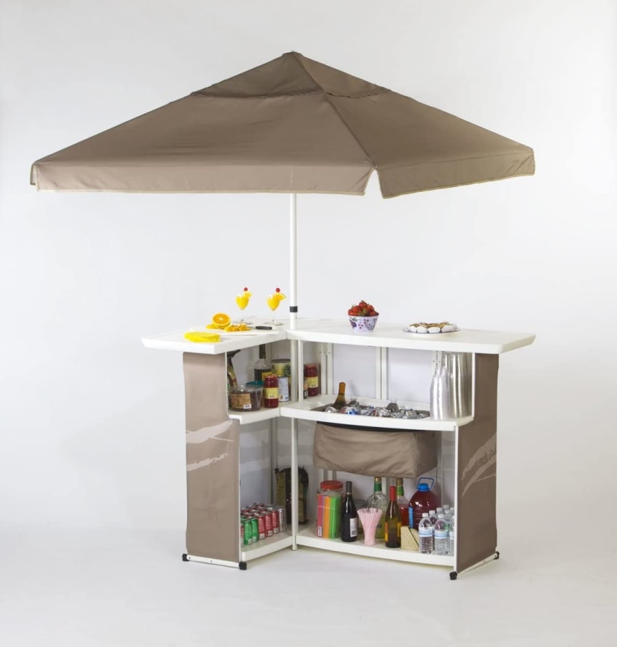 The Best of Times Solid Portable Bar with Umbrella is perfect for a tailgate or patio party. The L-shaped bar is 63in.L x 12in.D x 44in.H on front and 41in.L x 12in.D x 44in.H on the side. It can be set up in minutes, easily seating 4 people, and includes 2 integrated shelves with plenty of storage space and an in-shelf, food-grade waterproof cooler that holds up to a case of your favorite beverage. You also get a heavy-duty blow-molded plastic countertop and a 6ft. sq. market umbrella that stands 8ft. tall. Best of all, the entire set fits in a standard parking space. Includes a wheeled storage bag for easy transport. , Seating Capacity: 4, Primary Color: Black, Table Shape: L-shaped, Table Top Material: Heavy-duty blow-molded plastic