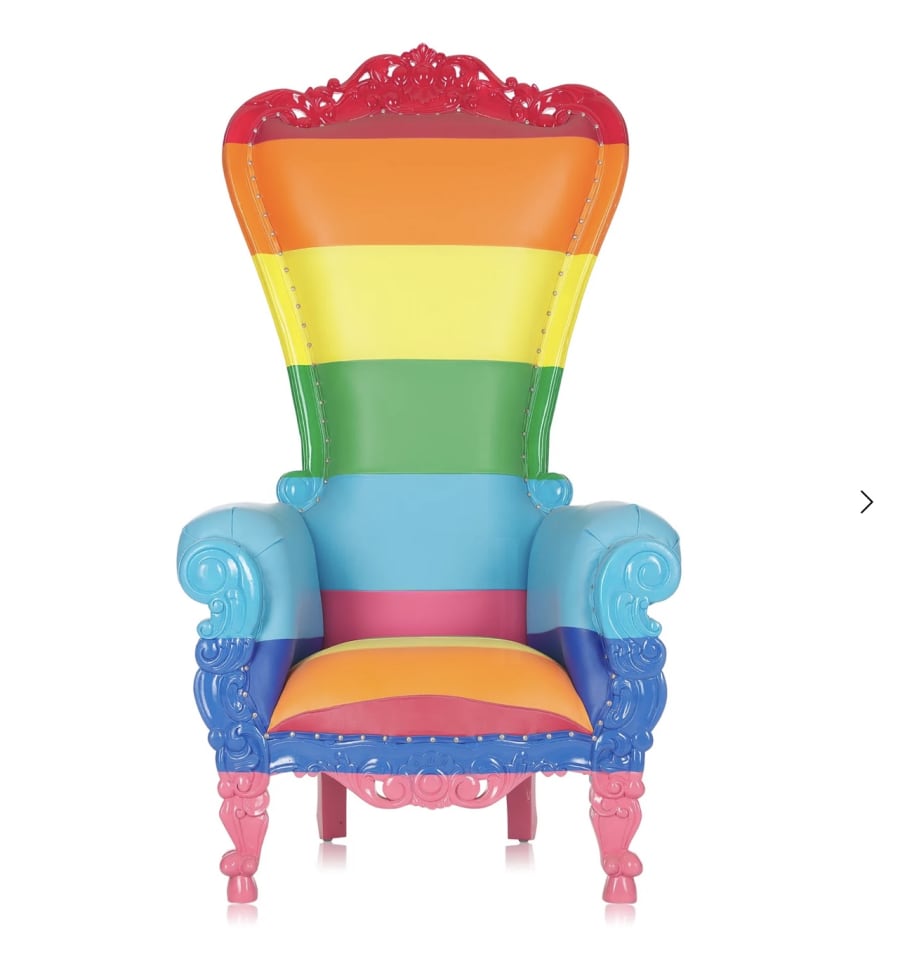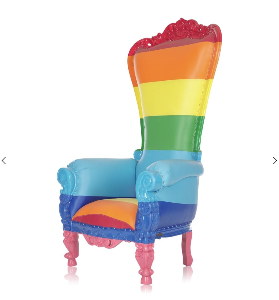 Bring some royalty into your life with this stunning "Tiffany pride edition" queen throne chair. Sit in absolute comfort with this beautiful chair! This chair would be stunning in all venues such as weddings, birthday parties, and much more! This chair is a part of our unique pride collection, it is absolutely unique and very spunky to the eyes!