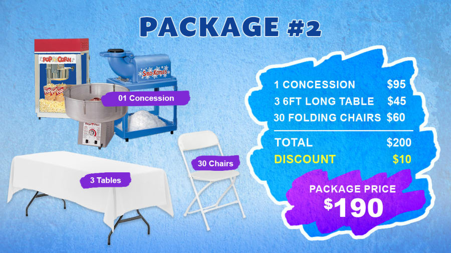 • 1 Concession Machine: Choose from a popcorn, cotton candy, or snow cone machine to delight your guests with a fun treat. Each machine comes with supplies to serve 25 people. Need more? Additional supply packs are available for just $37.50 each.
